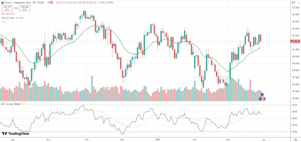 The EUR/JPY currency pair settled 0.58% lower at 162.192 on Friday.