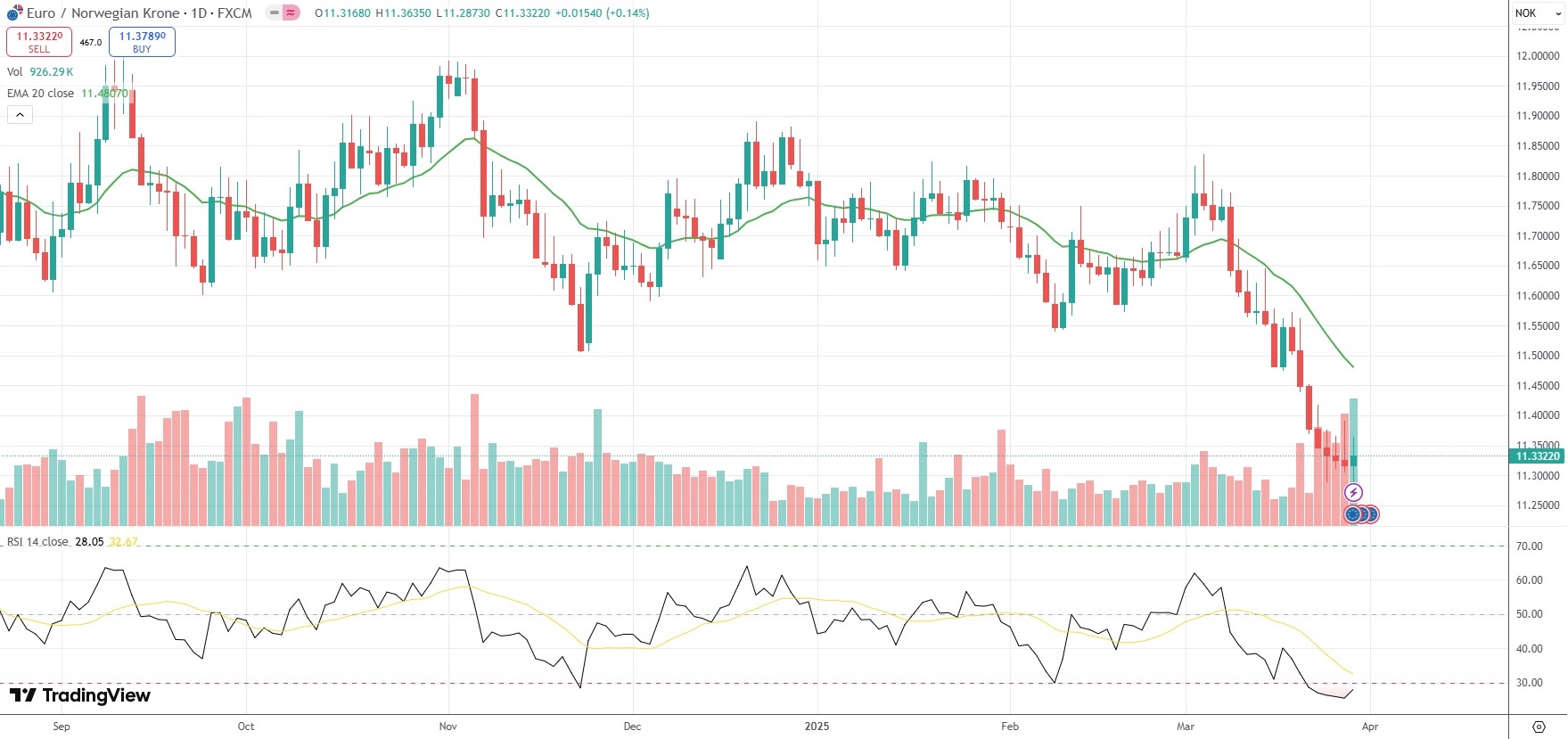 The EUR/NOK currency pair settled 0.14% higher at 11.3322 on Friday.