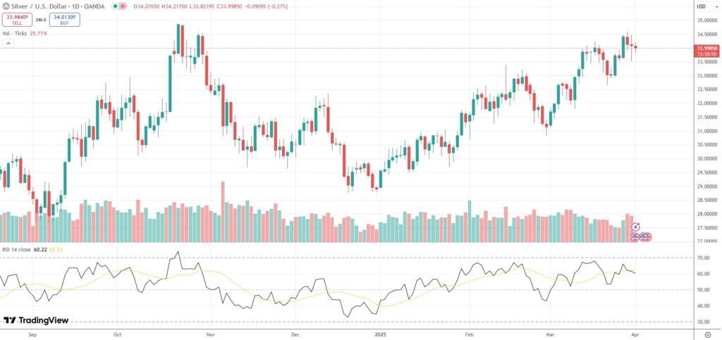 Spot Silver held not far from recent 22-week high of $34.59 per troy ounce on Tuesday, as market players awaited the upcoming US reciprocal tariff announcement.