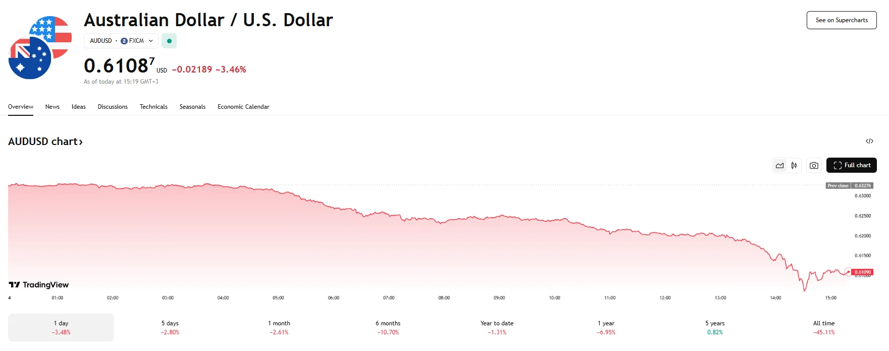- The counter-tariffs hit numerous asset classes, with the AUD/USD falling 3.46%.