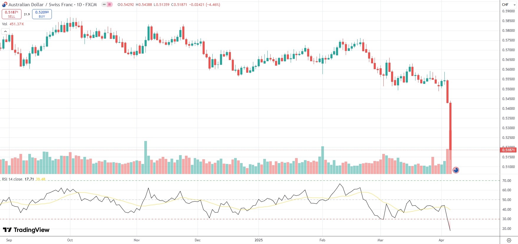The AUD/CHF currency pair settled 4.46% lower at 0.5187 on Friday.