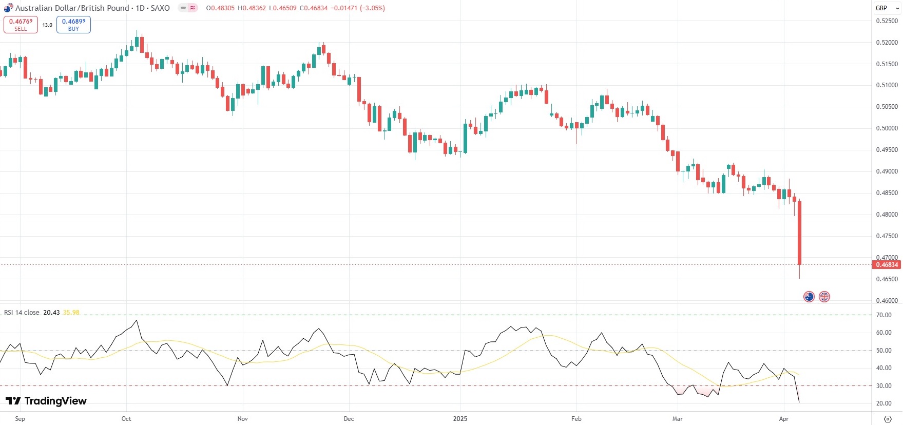 The AUD/GBP currency pair settled above a fresh 112 1/2-month low of 0.4651 and registered its worst weekly performance since late September 2022, after China’s retaliatory move to US tariffs.