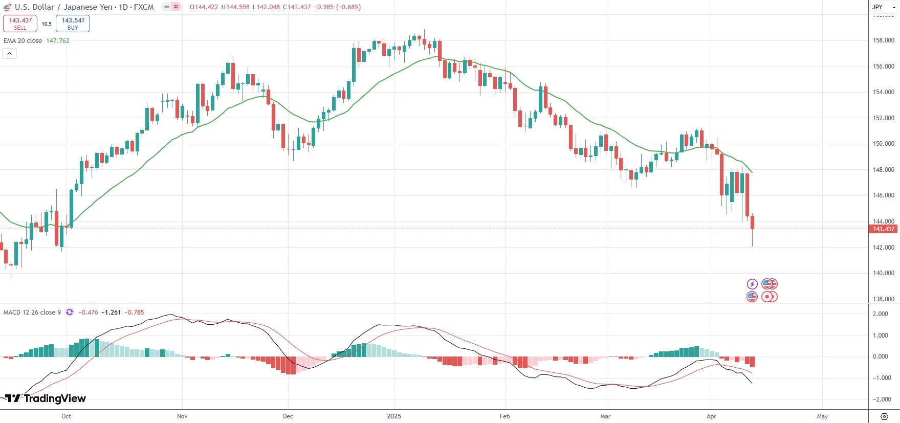 The USD/JPY currency pair settled above Friday’s low of 142.048, its weakest level since September 30th 2024, as escalating trade tensions and rising concerns over a wider economic fallout for the US have shaken confidence in US assets, triggering bond market sell-off and supporting traditional safe haven currencies such as the Japanese Yen.