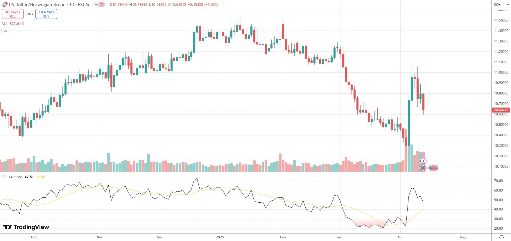 The USD/NOK currency pair settled below recent high of 11.0564, its strongest level since March 5th, as escalating trade tensions and rising concerns over a wider economic fallout for the US have shaken confidence in US assets, weighing on the greenback.