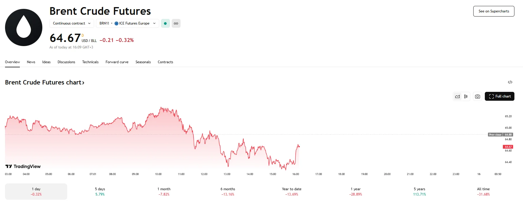 - Brent crude futures slid 0.32%, reaching $64.67.