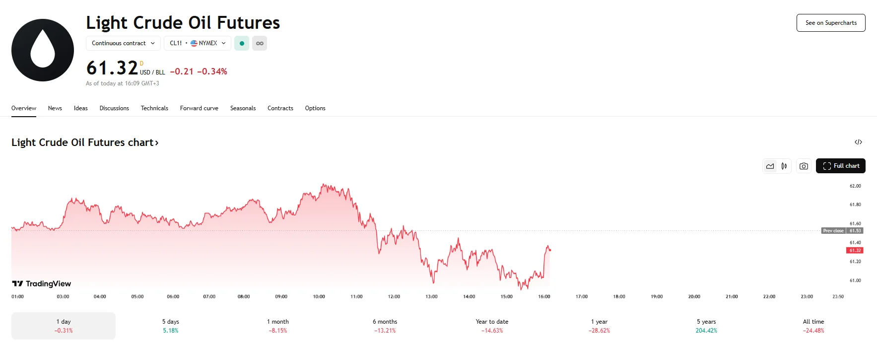 - WTI futures also slipped, shedding 0.34% to $61.32.