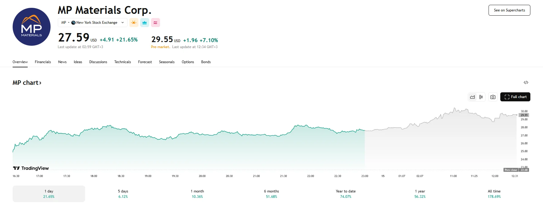MP Materials’ stock value skyrocketed on Monday, with shares soaring by an impressive 21.65% to close the trading session at $27.59. This significant upward movement reflected a surge in investor confidence, primarily driven by geopolitical developments impacting the critical rare earth minerals market. The rally continued into Tuesday, with the stock price climbing an additional 7.10% during pre-market hours, breaching the $29 mark.