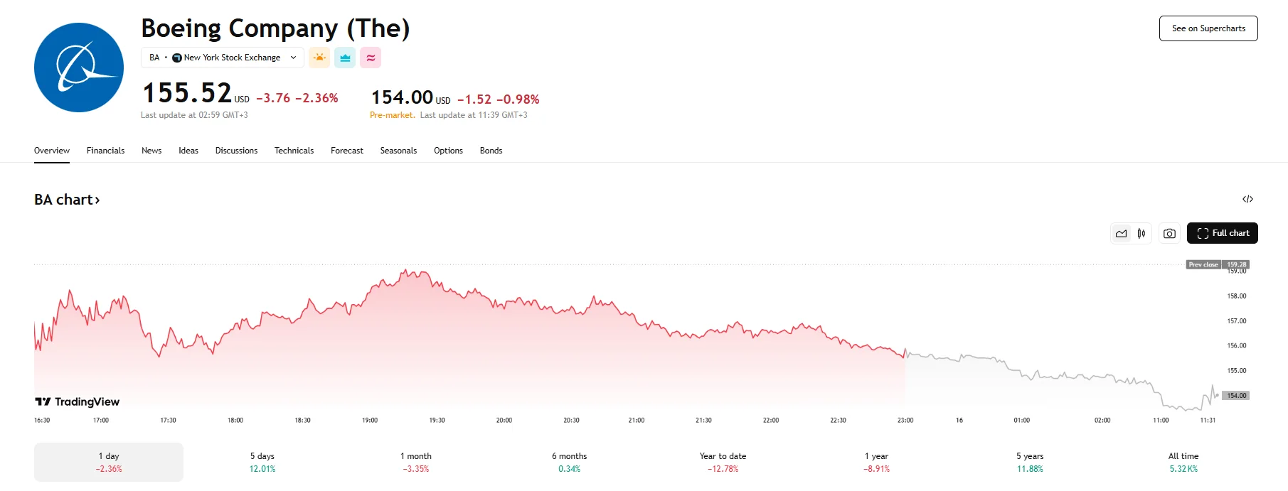 - Boeing’s stock plummeted by 2.36% on Tuesday, closing at $155.52.