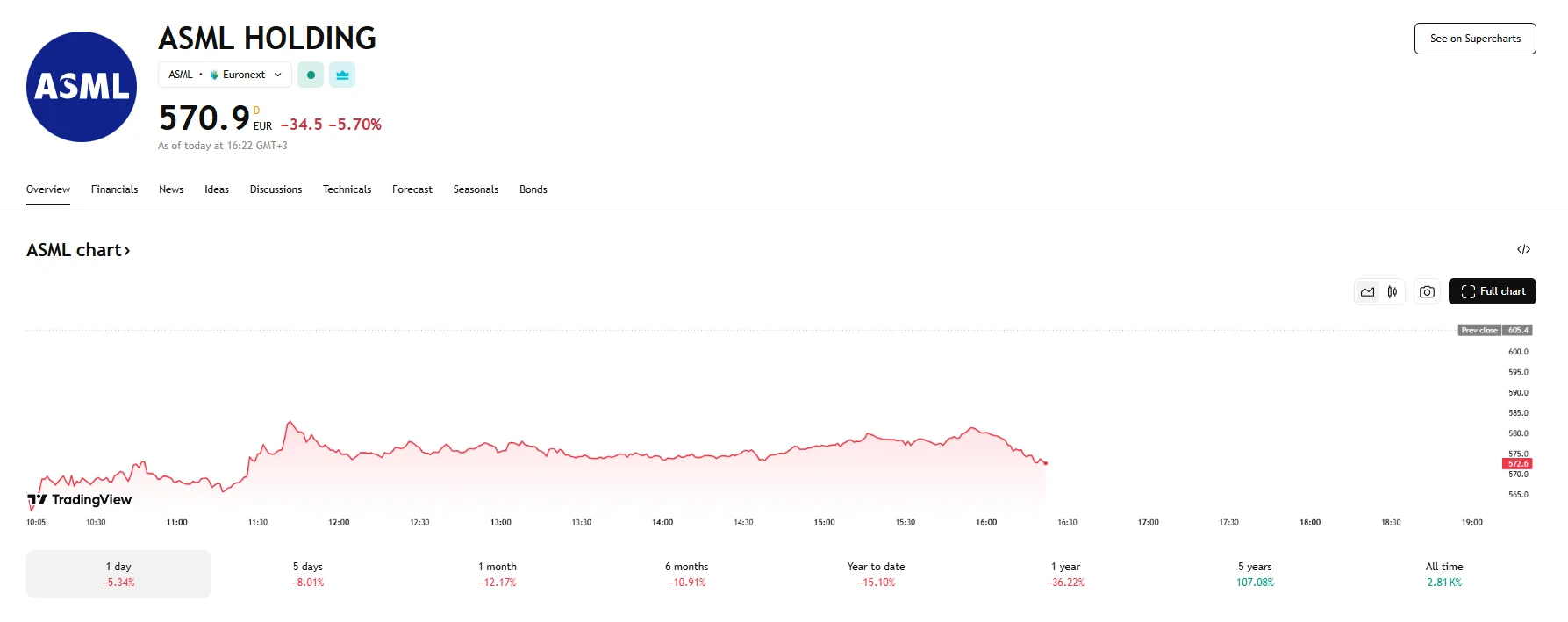 - Dutch semiconductor supplier ASML’s stock suffered a 5.7% loss.