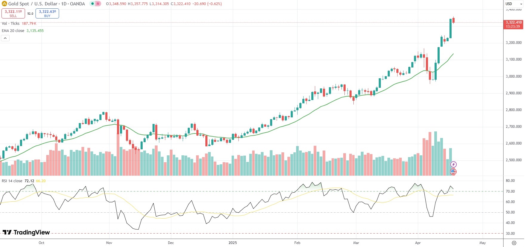 Spot Gold registered yet another all-time high of $3,357.40 per troy ounce on Thursday, after which pulled back from that level as investors likely took profits.