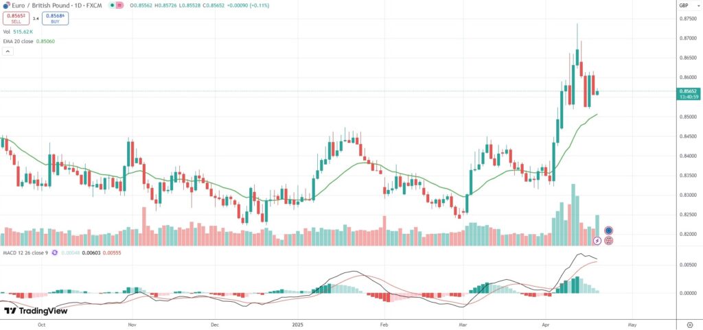 The EUR/GBP currency pair was last up 0.11% on the day to trade at 0.8565.