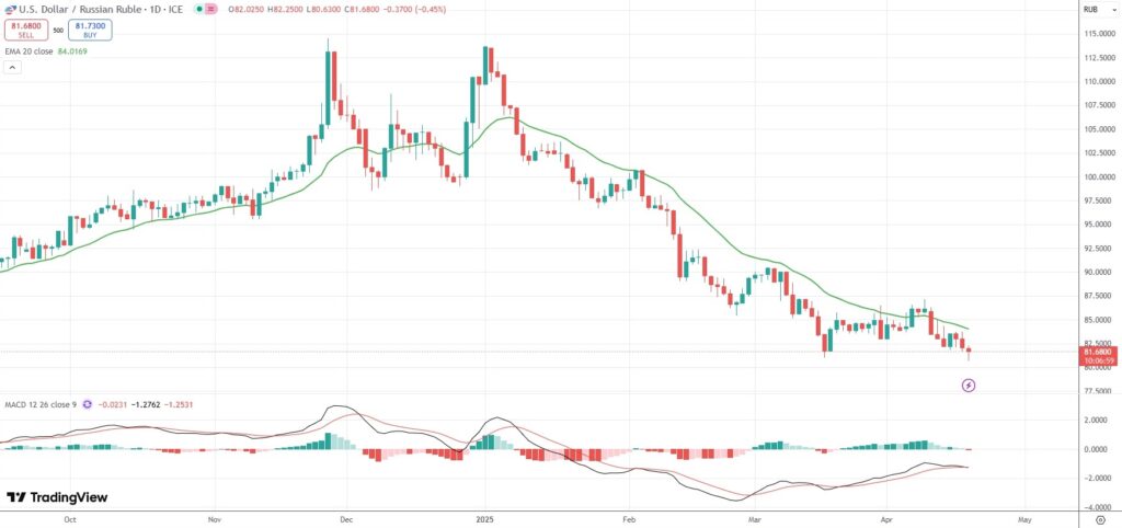 The USD/RUB currency pair was last down 0.45% on the day to trade at 81.6800. Earlier in the session, the exotic Forex pair went down as low as 80.6300, its weakest level since June 7th 2023.