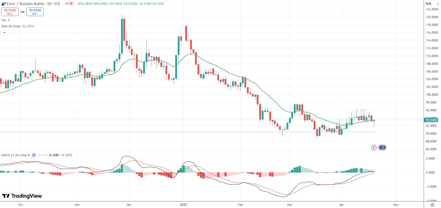 The EUR/RUB currency pair settled 0.12% higher at 93.5320 on Friday.
