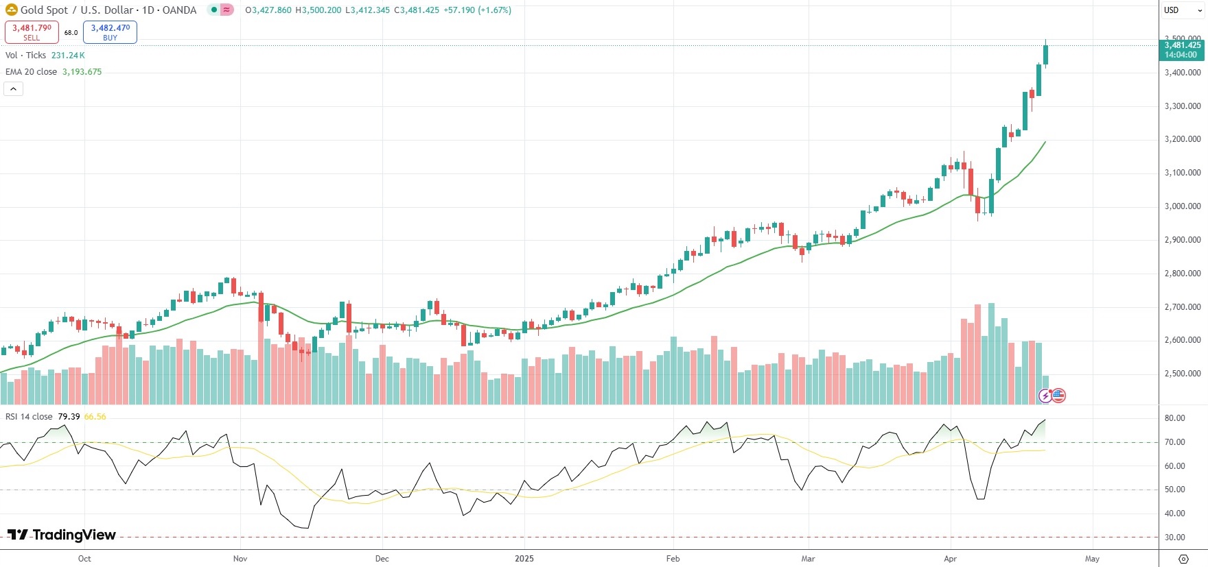 Spot Gold registered a fresh all-time high of $3,500.12 per troy ounce on Tuesday amid investor rush to safety due to heightening economic uncertainty.