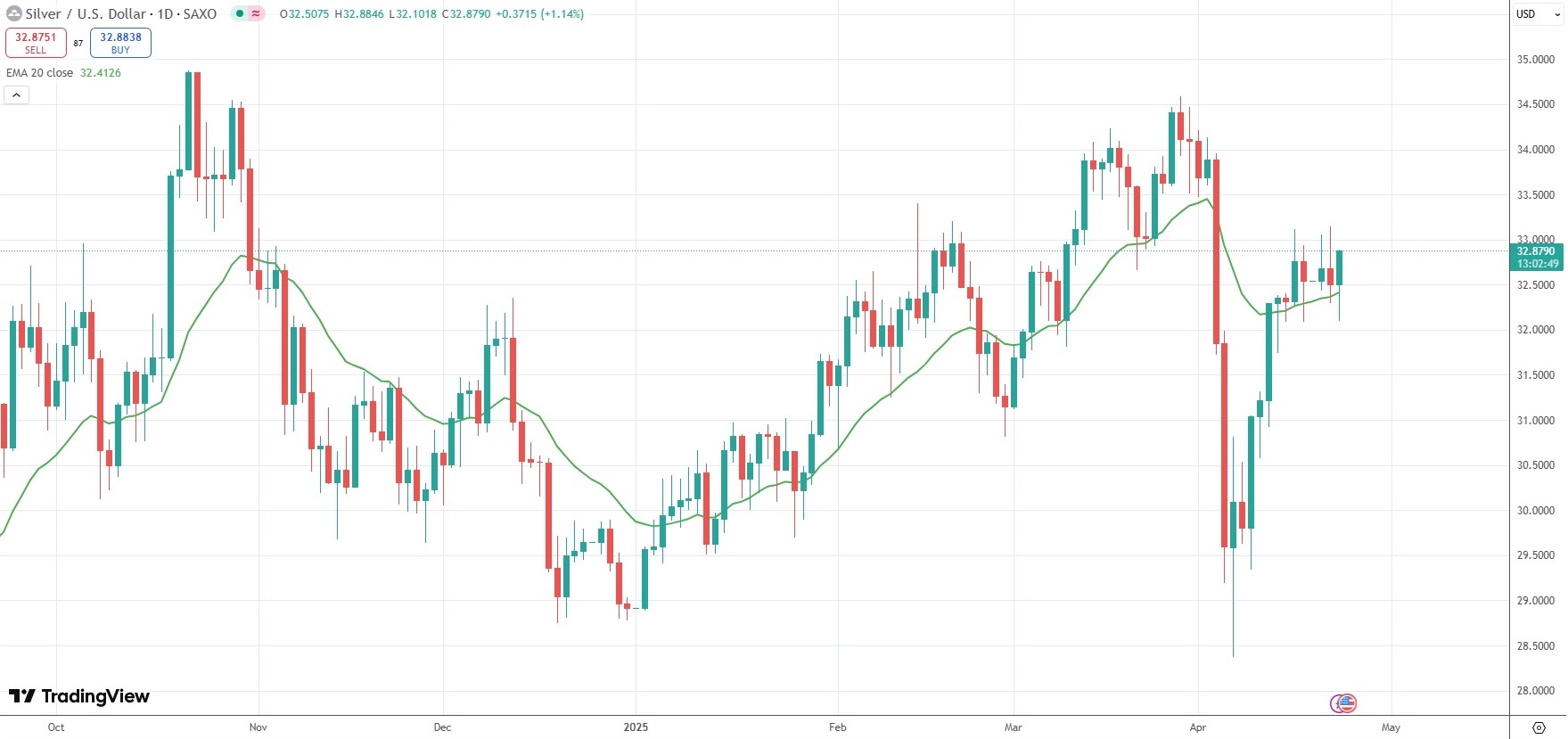 Spot Silver rose more than 1% on Wednesday, holding near the $33 mark, as it tracked a broader rally in commodities due to signs of easing trade tensions between the US and China.