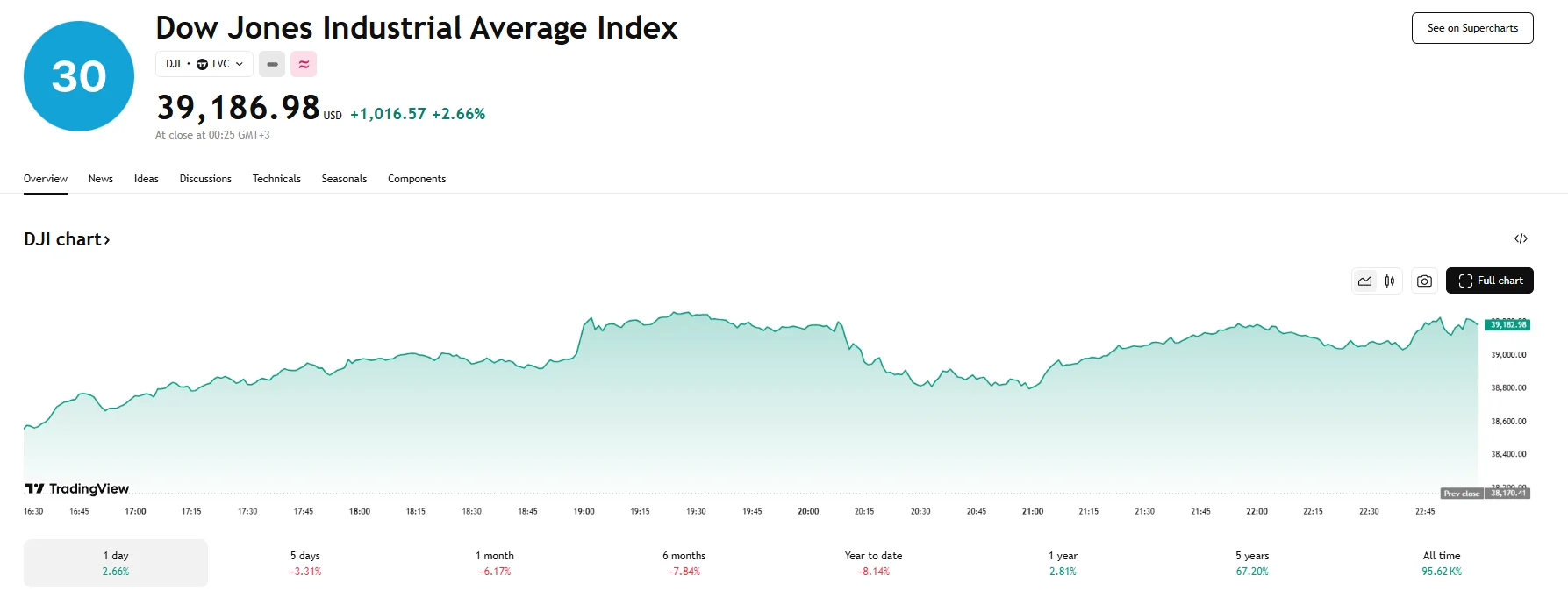 Wall Street roared on Tuesday, with the Dow Jones Industrial Average skyrocketing by 1,016 points (2.66%) to close at 39,186.98, marking its best performance in weeks. The S&P 500 followed suit, climbing 2.51% to 5,287.77, while the Nasdaq Composite and Nasdaq 100 each gained more than 400 basis points.