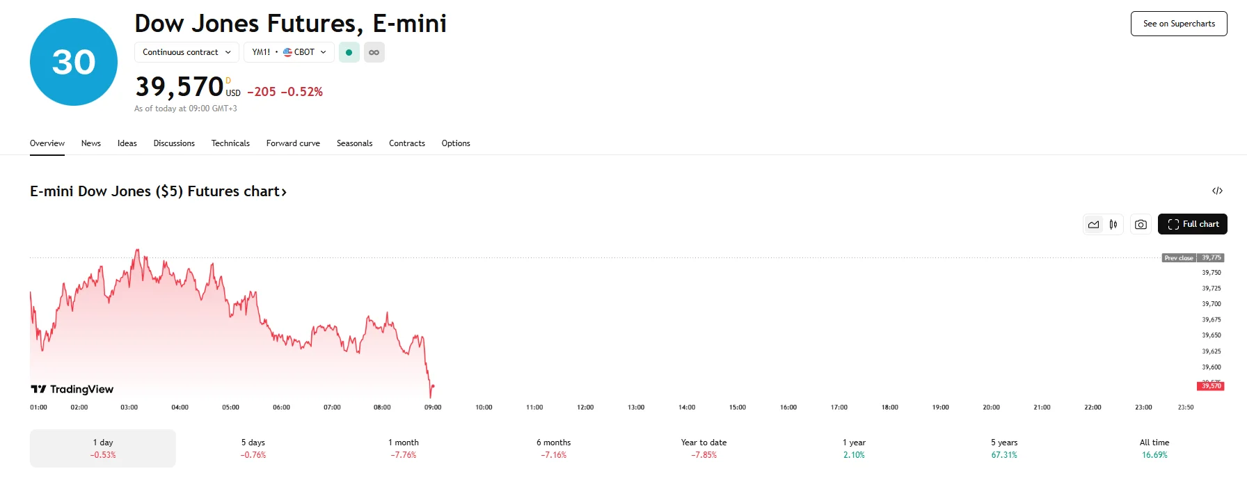 Despite the strong performance on Wednesday, the positive sentiment did not carry over into Thursday’s pre-market trading. Stock futures across the board edged lower, suggesting a potentially weaker opening for the main indices. Dow e-mini futures saw a decline of 0.52%, shedding 205 points to reach 39,570. Similarly, S&P 500 futures dropped by 0.37%, and Nasdaq e-minis fell by 0.47%, trading at 18,716.25. This retreat indicated that while the previous day’s gains were significant, market participants were adopting a more cautious outlook.