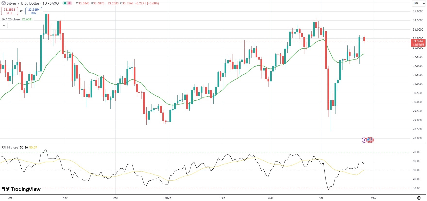 Spot Silver was last down 0.68% on the day to trade at $33.35 per troy ounce.