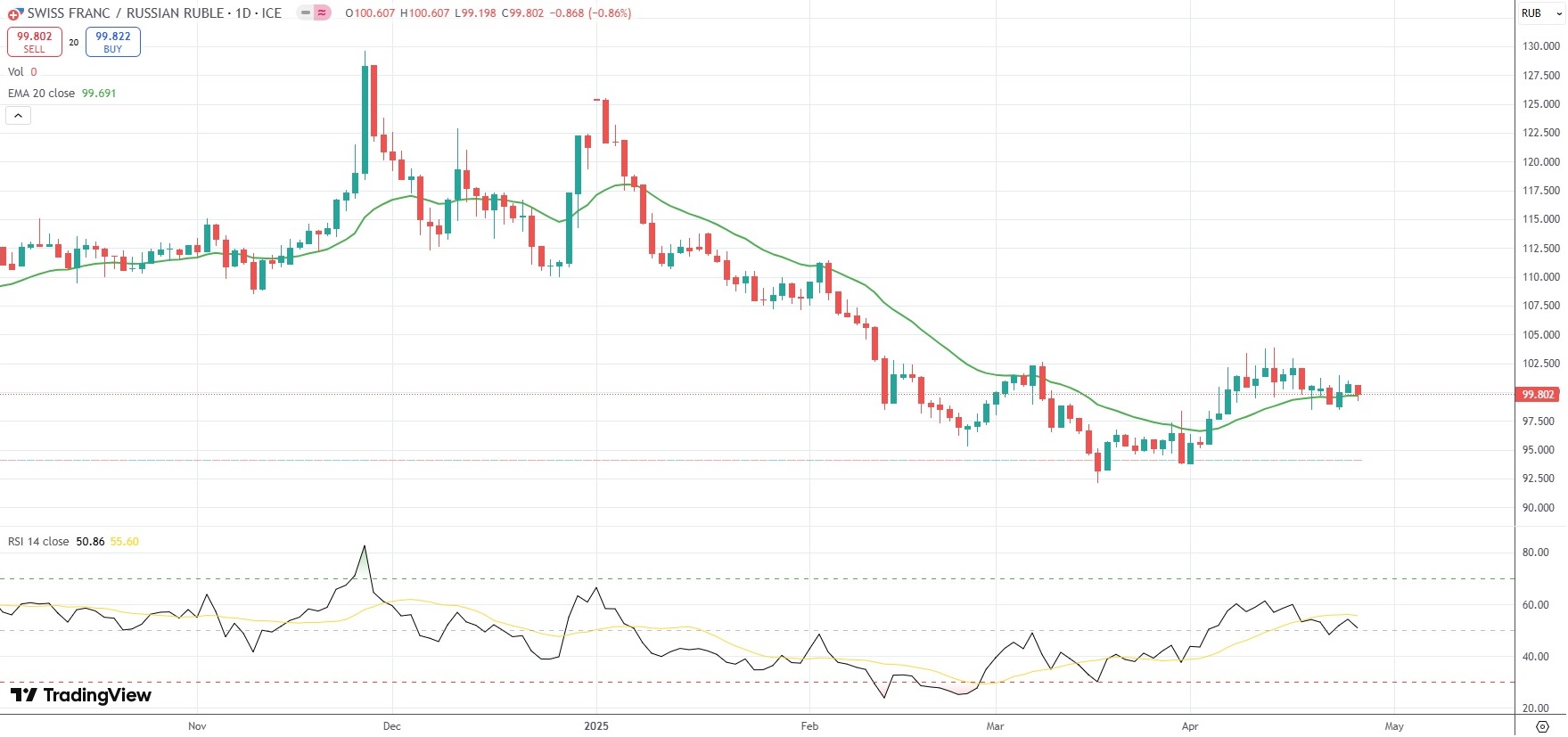 The CHF/RUB currency pair settled 0.86% lower at 99.802 on Friday.