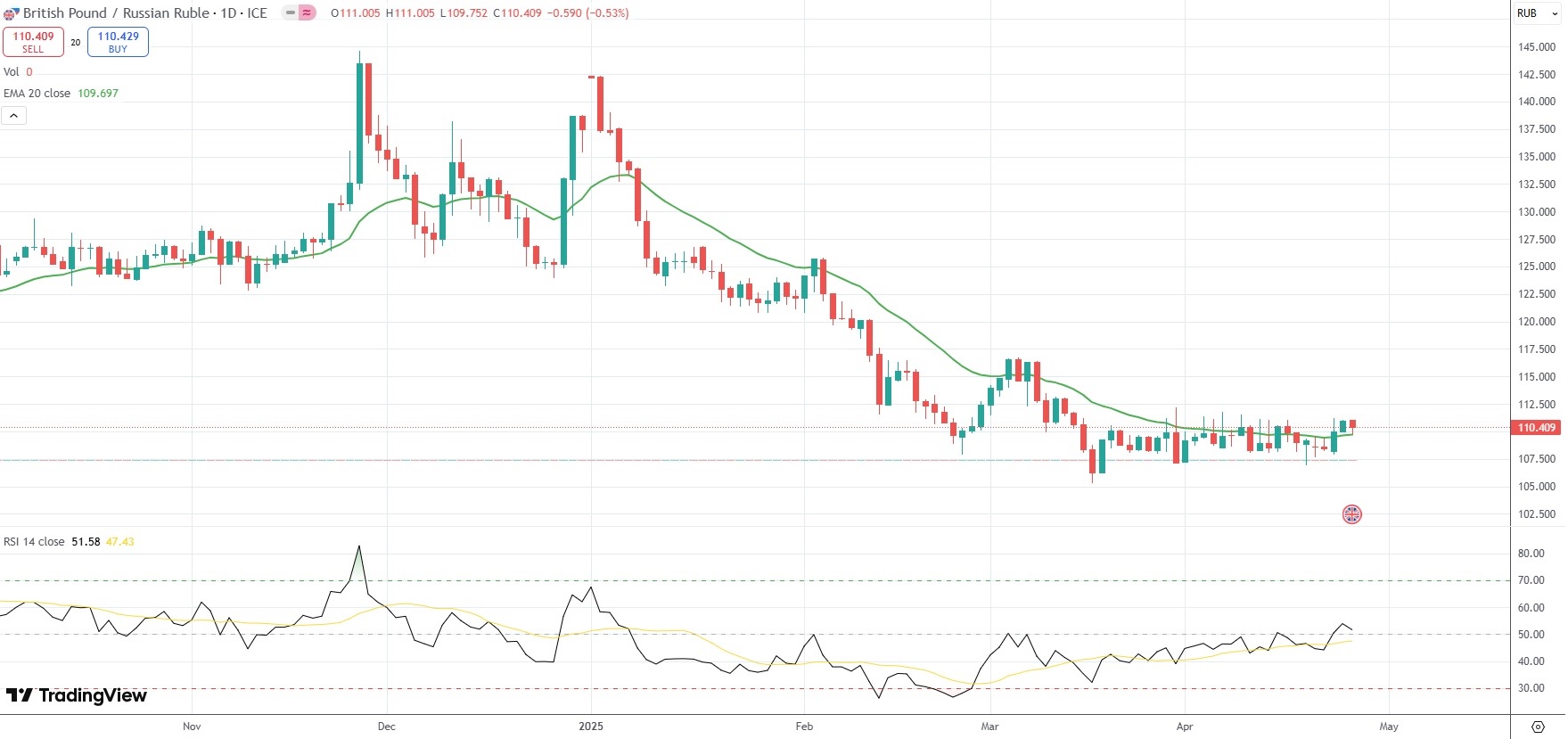 The GBP/RUB currency pair settled 0.53% lower at 110.409 on Friday.