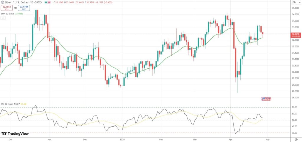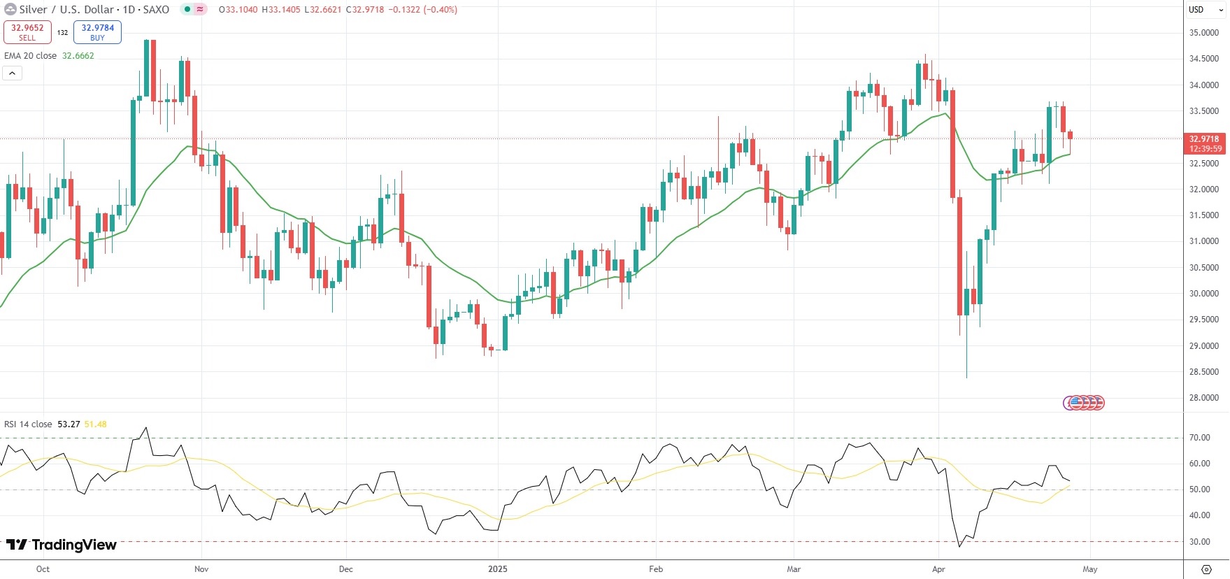 Spot Silver was last down 0.40% on the day to trade at $32.97 per troy ounce.