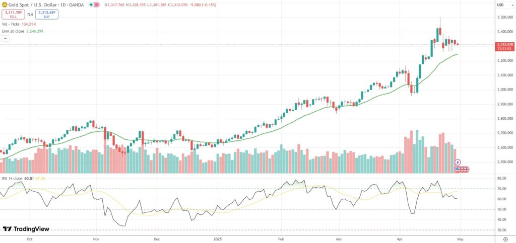 Spot Gold was last down 0.15% on the day to trade at $3,312.07 per troy ounce.