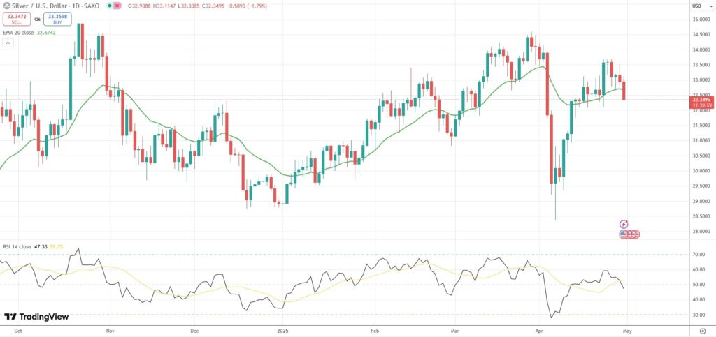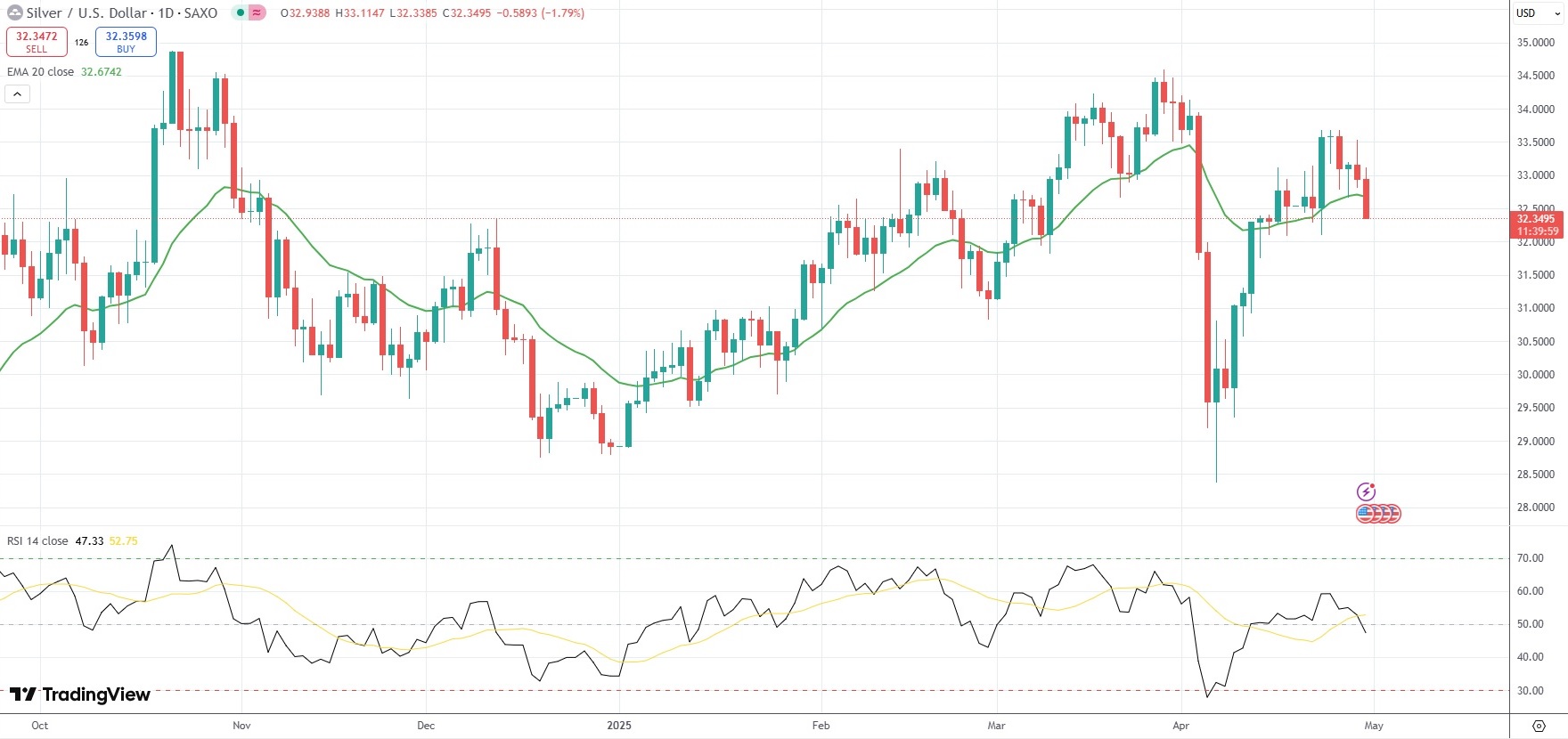 Spot Silver slid to a fresh 1-week low of $32.34 per troy ounce on Wednesday, as abating concerns over the US tariff impact reduced demand for safe-haven metals.