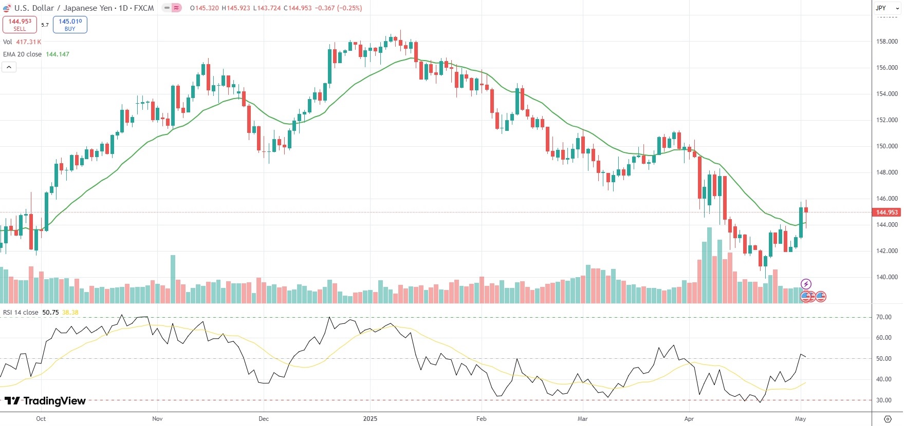 The USD/JPY currency pair settled 0.25% lower at 144.953 on Friday.