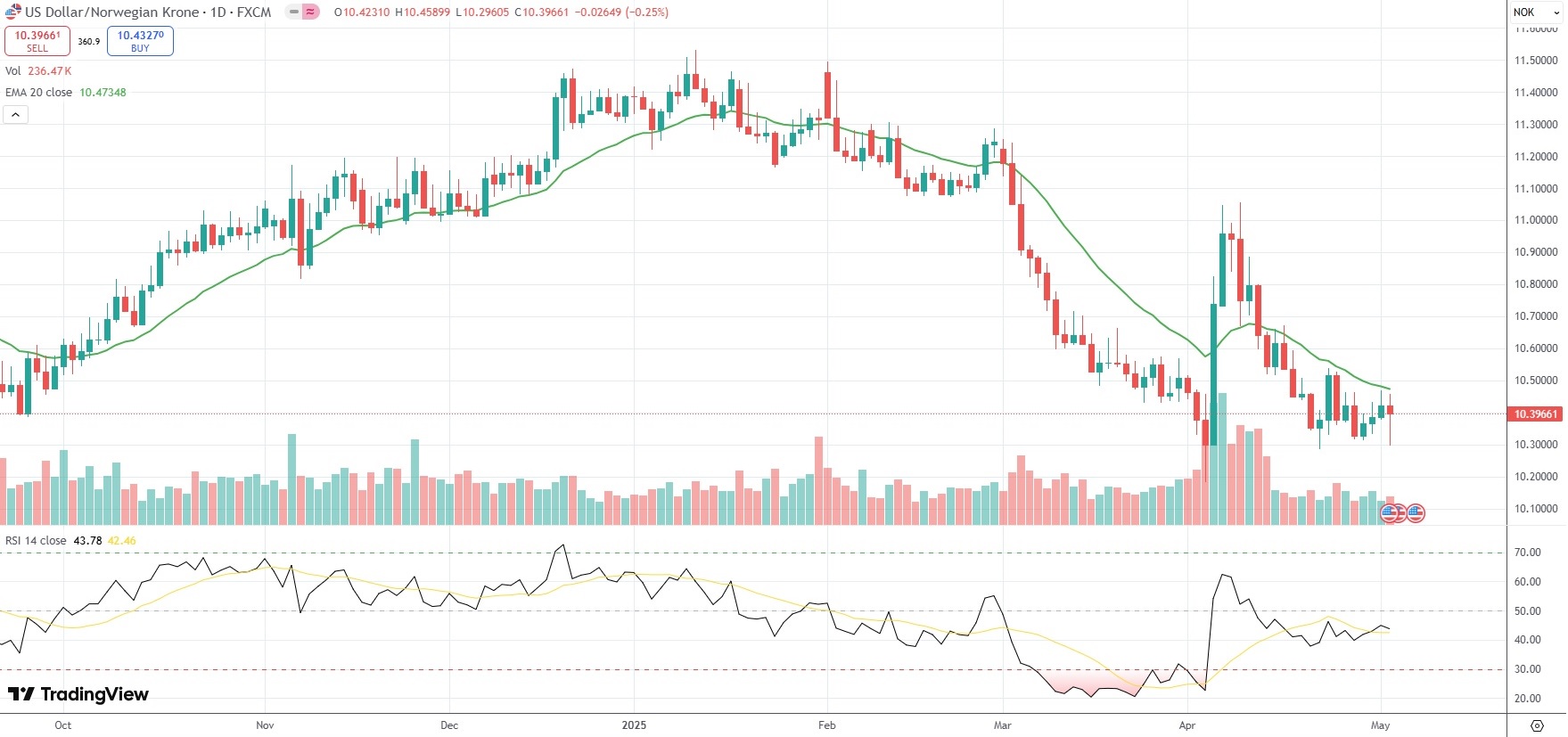 The USD/NOK currency pair settled 0.25% lower at 10.3966 on Friday.