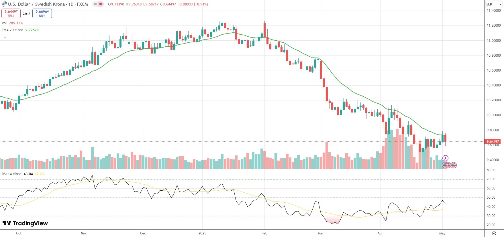 The USD/SEK currency pair settled 0.91% lower at 9.6449 on Friday.