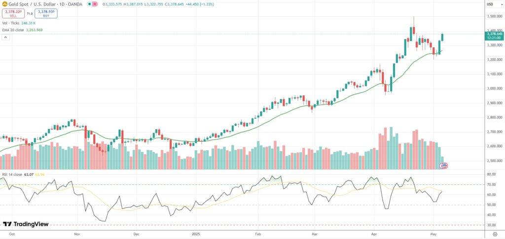 Spot Gold registered a fresh 2-week high of $3,387 per troy ounce on Tuesday, as the Trump administration opened a new front in the trade war, fueling demand for safe-haven assets.