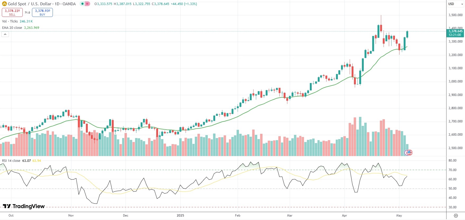 Spot Gold was last up 1.33% on the day to trade at $3,378.64 per troy ounce.