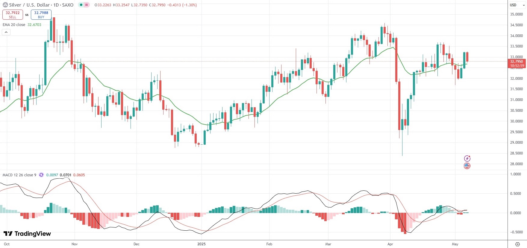 Spot Silver pulled back from a 1-week high of $33.25 on Wednesday, since optimism over potential US-China trade negotiations heightened investor risk appetite, while weighing on safe-haven assets.