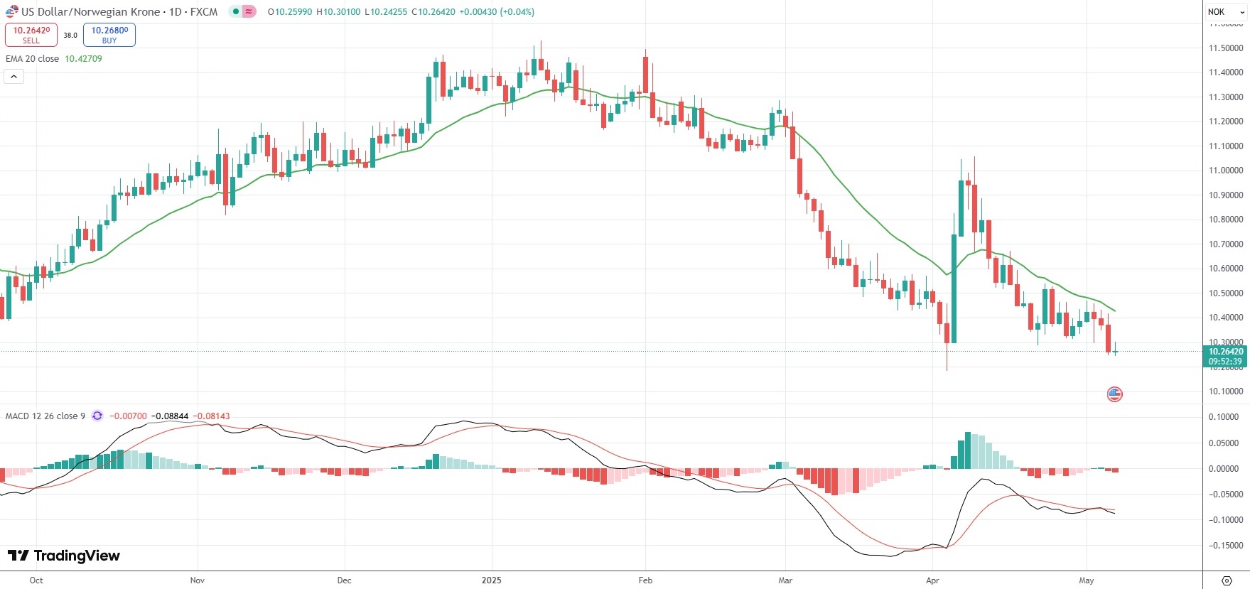The USD/NOK currency pair was last little changed on the day to trade at 10.2642.
