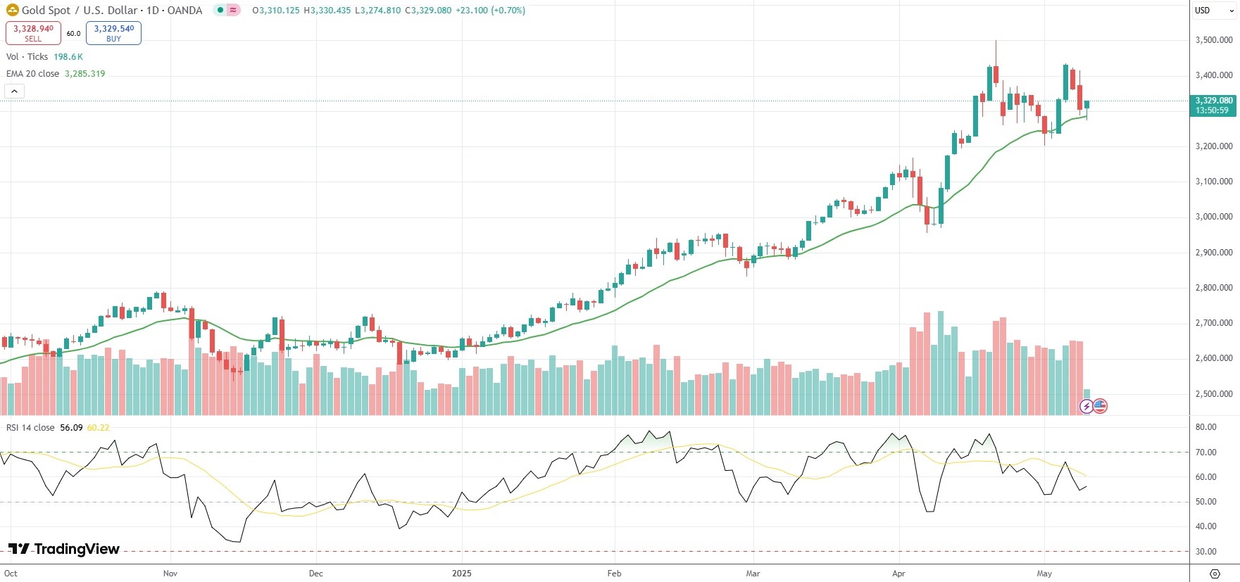 Spot Gold was last up 0.70% on the day to trade at $3,329.08 per troy ounce.