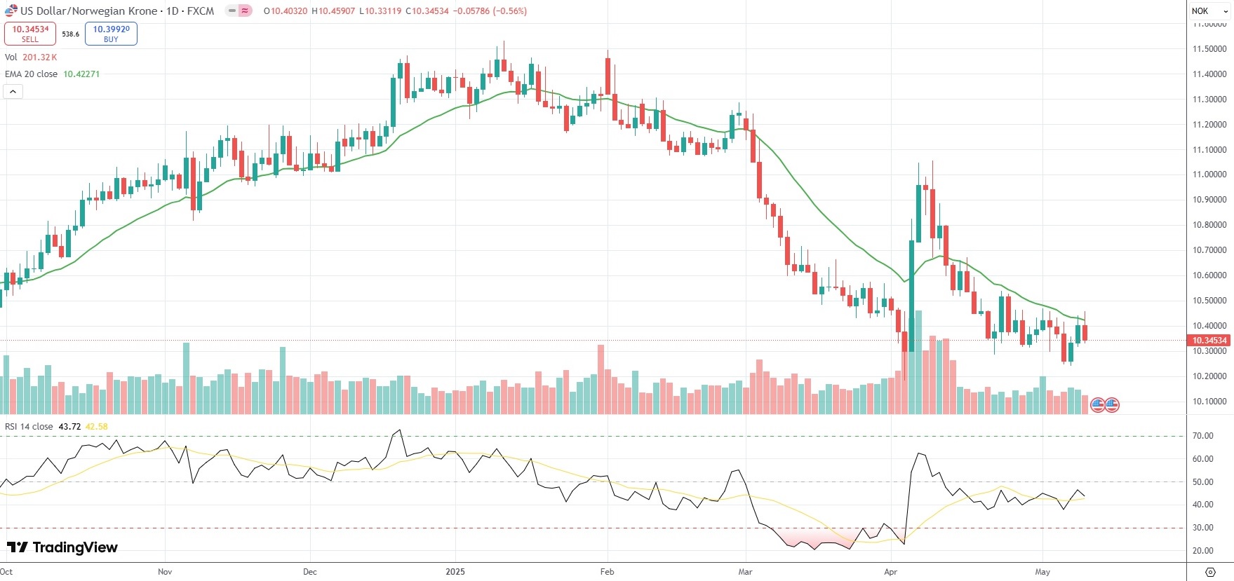 The USD/NOK currency pair settled 0.56% lower at 10.3453 on Friday.