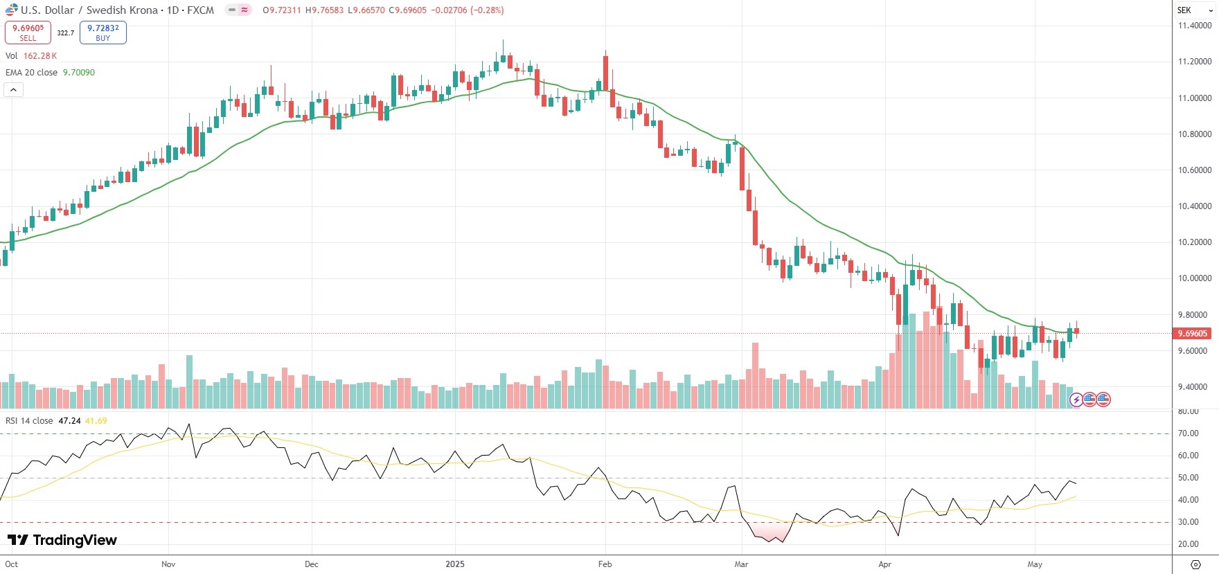 The USD/SEK currency pair settled 0.28% lower at 9.6960 on Friday.