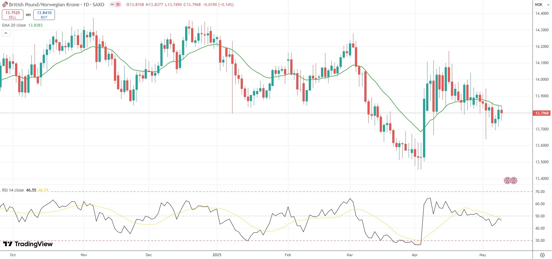 The GBP/NOK currency pair settled 0.14% lower at 13.7968 on Friday.