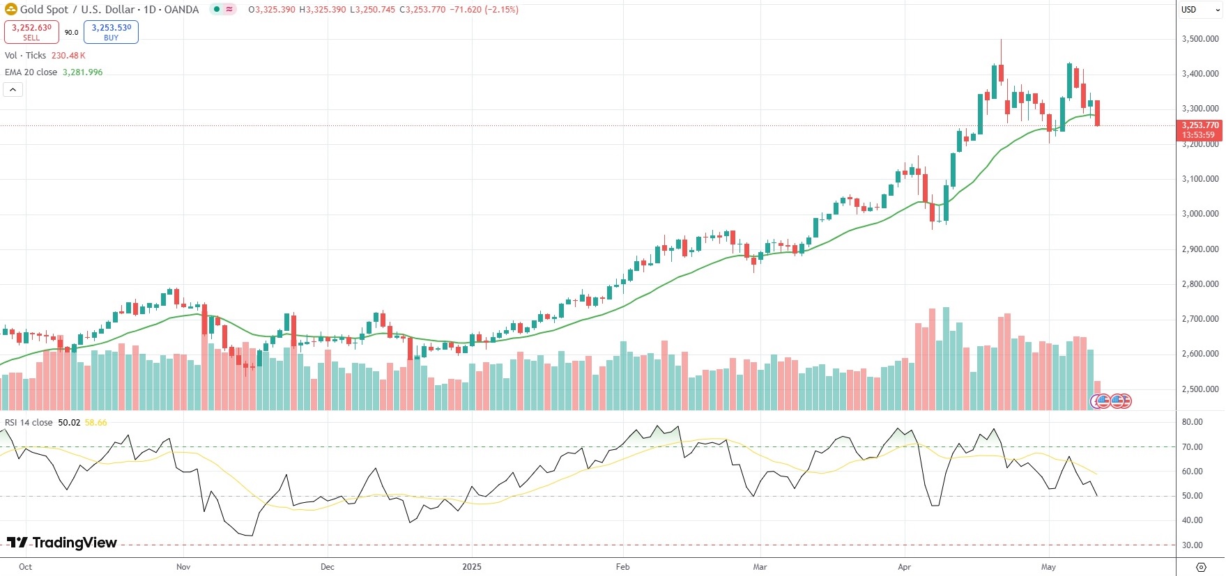 Spot Gold retreated to a one-week low of $3,250.74 on Monday, as optimism regarding the US-China trade negotiations led to an investor move from safe-haven assets toward riskier instruments.