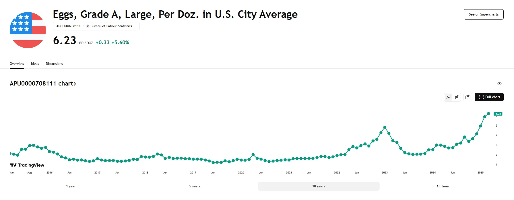 Despite the decline, costs remain significantly above typical levels. Compared to the same month last year, April’s average price represented a 79% increase from $2.86 per dozen. As seen below, March had seen prices reach a record $6.23, making this pullback in April notable, though not yet a sign of full recovery.