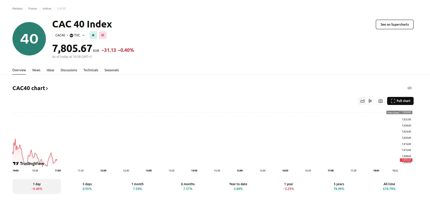 On Wednesday, the CAC 40 index fell 0.47% at the close as losses in key sectors dragged stocks lower. Thursday saw the index fall further, dropping 0.4% to hit 7,805.67.