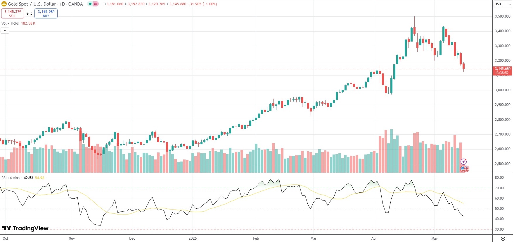 Spot Gold was last down 1.00% on the day to trade at $3,145.68 per troy ounce.