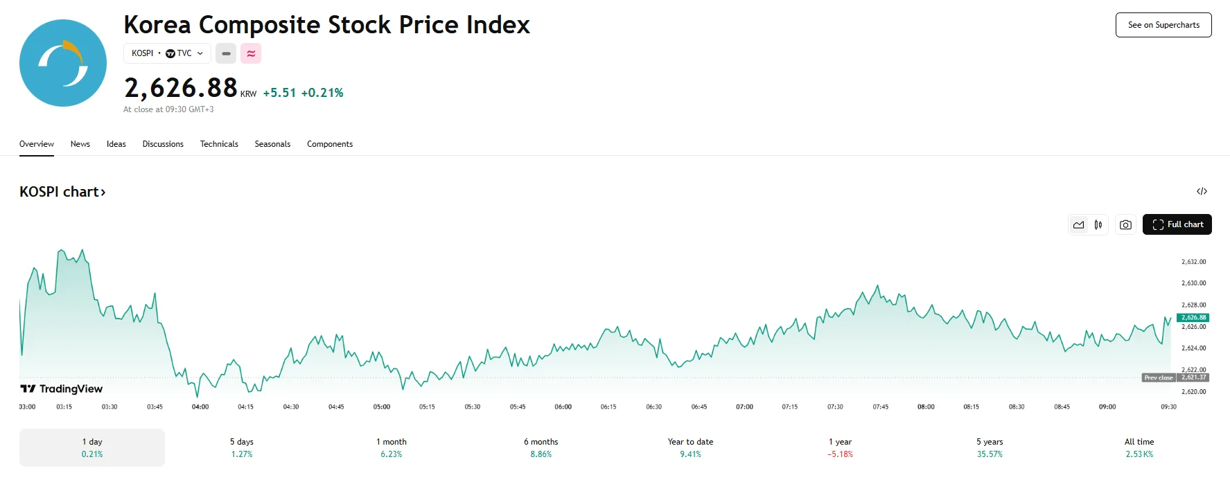 The benchmark KOSPI index finished the trading session with a gain of 5.51 basis points, up 0.21% to 2,626.87. For the week, the index advanced just short of 2%. A total of 316 stocks rose, while 581 saw their share prices drop.
