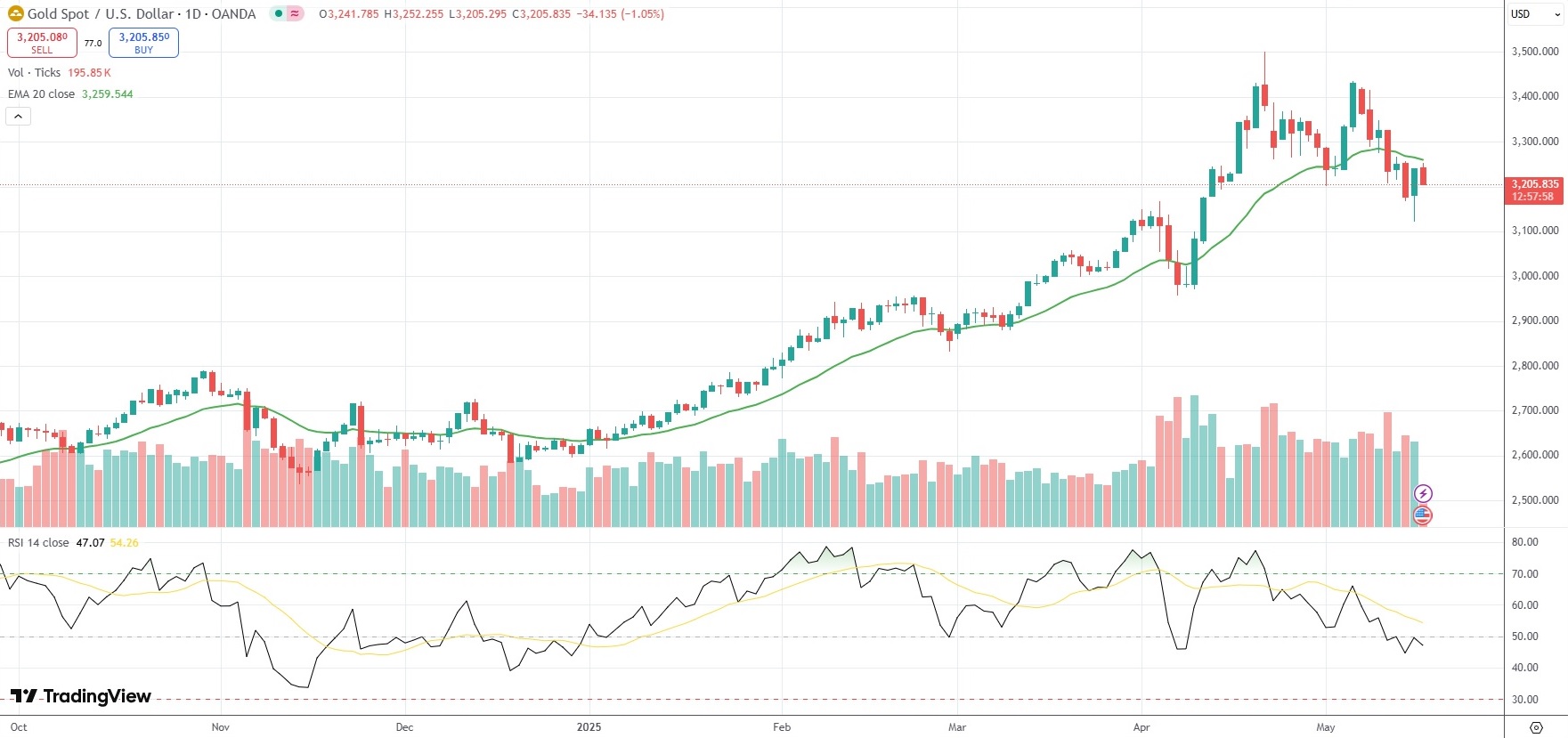 Spot Gold was last down 1.05% on the day to trade at $3,205.83 per troy ounce.