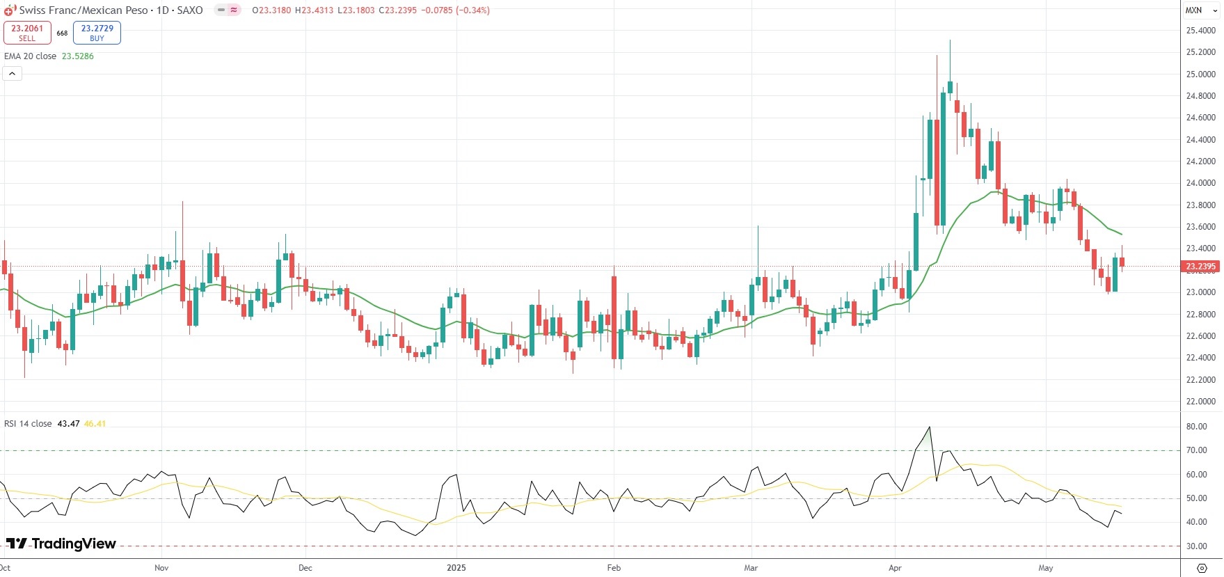 The CHF/MXN currency pair settled 0.34% lower at 23.2395 on Friday.