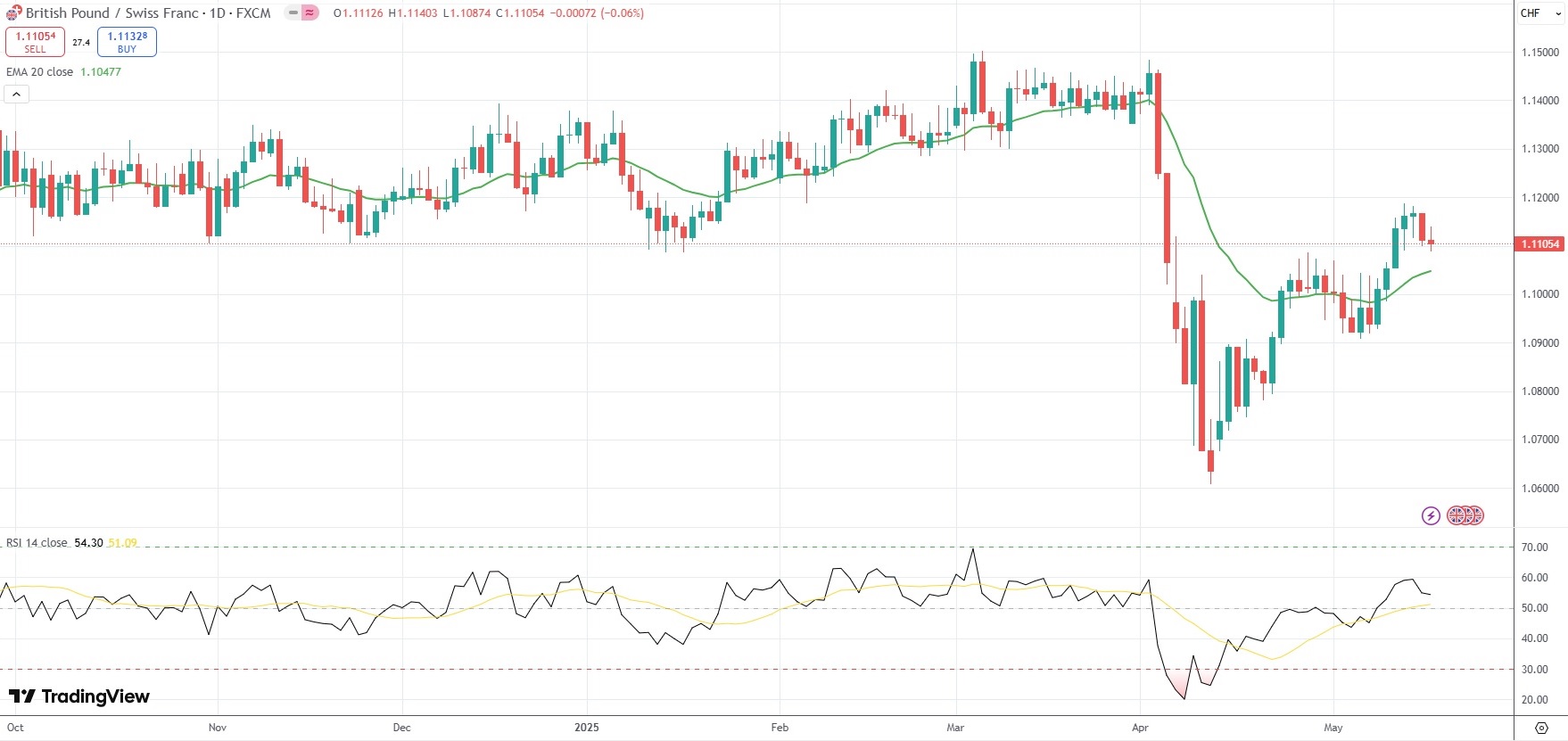 The GBP/CHF currency pair settled 0.06% lower at 1.1105 on Friday.