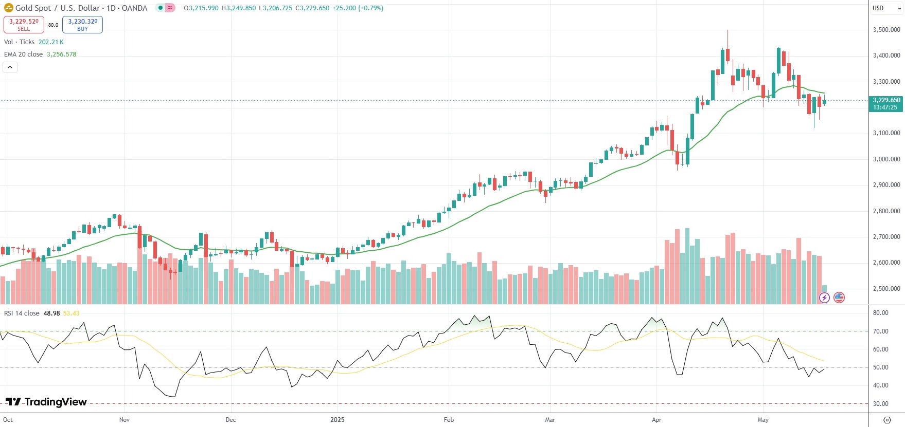 Spot Gold was last up 0.79% on the day to trade at $3,229.65 per troy ounce.
