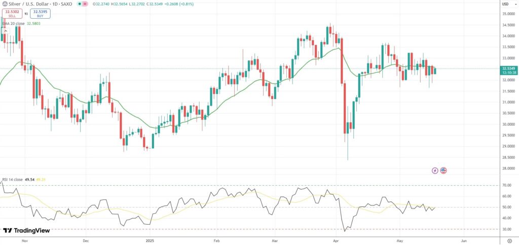 Spot Silver was last up 0.81% on the day to trade at $32.53 per troy ounce.