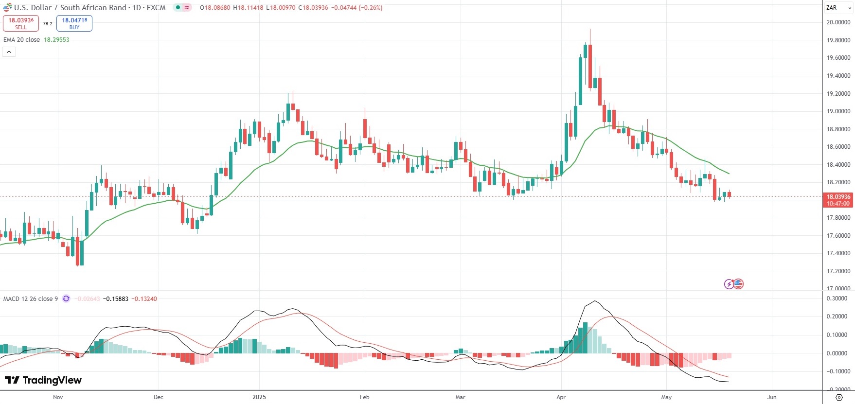 The USD/ZAR currency pair was last down 0.26% on the day to trade at 18.0394.