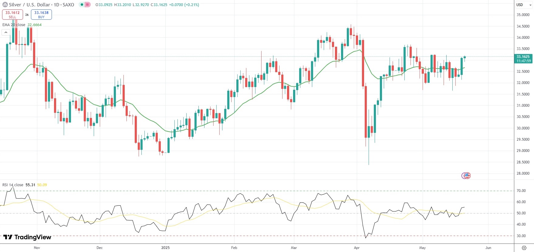 Spot Silver scaled a fresh 1-week high of $33.20 per troy ounce on Wednesday on the back of a weaker US Dollar and amid US fiscal uncertainty.